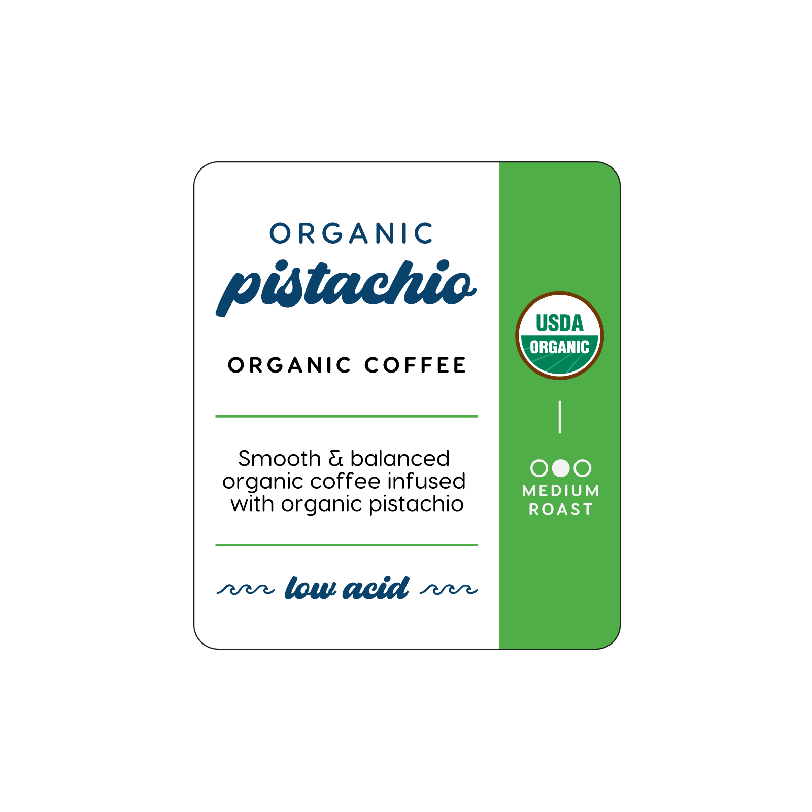 Smooth, mellow, and just a little nutty—in the best way. Our USDA organic beans are carefully roasted for that signature low-acid, easy-drinking experience, then infused with organic pistachio flavor for a creamy, lightly toasted sweetness. The result is balanced, relaxed, and effortlessly enjoyable—crafted for easy mornings, beachy afternoons, and anyone who loves quality coffee with a fun, flavorful twist.